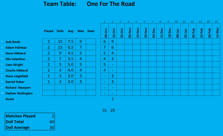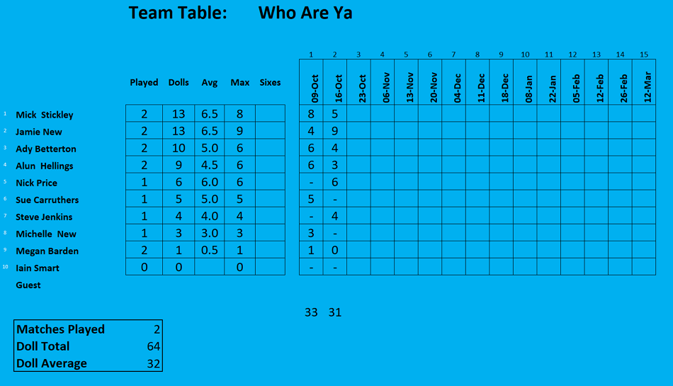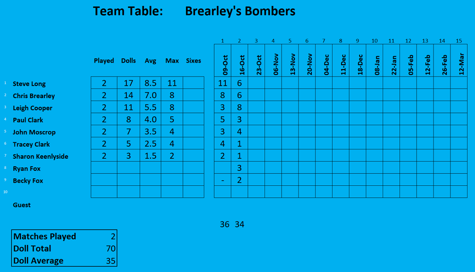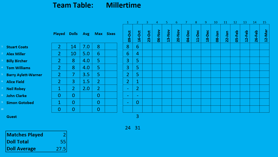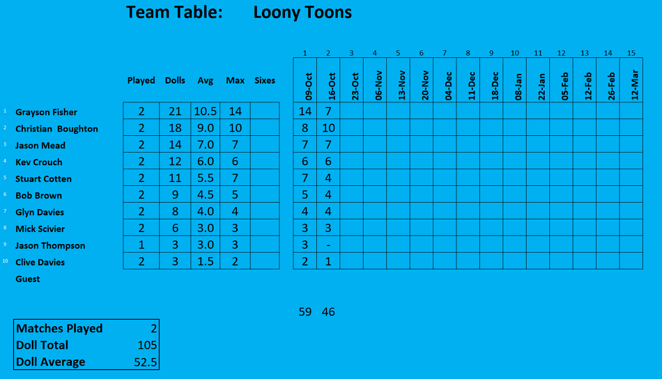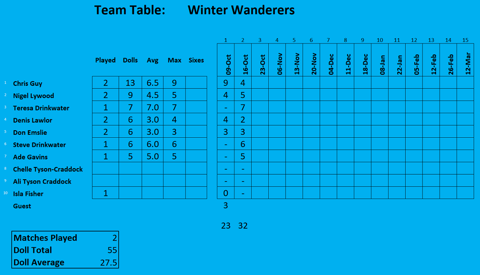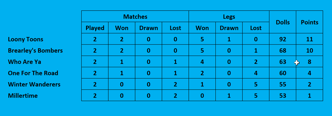 League Table doll totals will always be less than Team Table doll totals, because only the highest six player scores per leg contribute to the League Table | ||