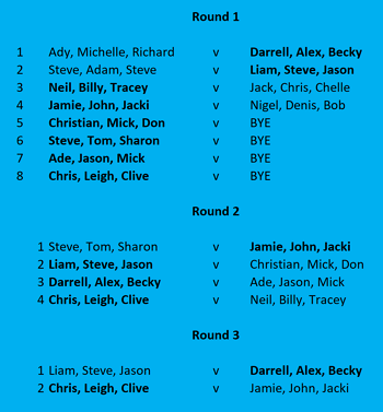 | Results of the 3 A Side heats: Congratulations to finalists Chris / Leigh / Clive and Darrell / Becky / Alex | ||||