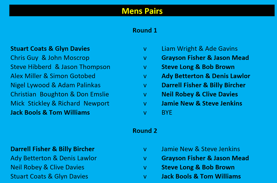 | Because of some spare time, the Men's Pairs semi-finals were played out. Congratulations to finalists Jack/Tom and Darrell/Billy | ||||