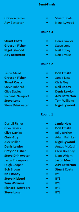 | Because of available time, the heats were played out to finalists. Congratulations to Darrell & Steve H | ||||