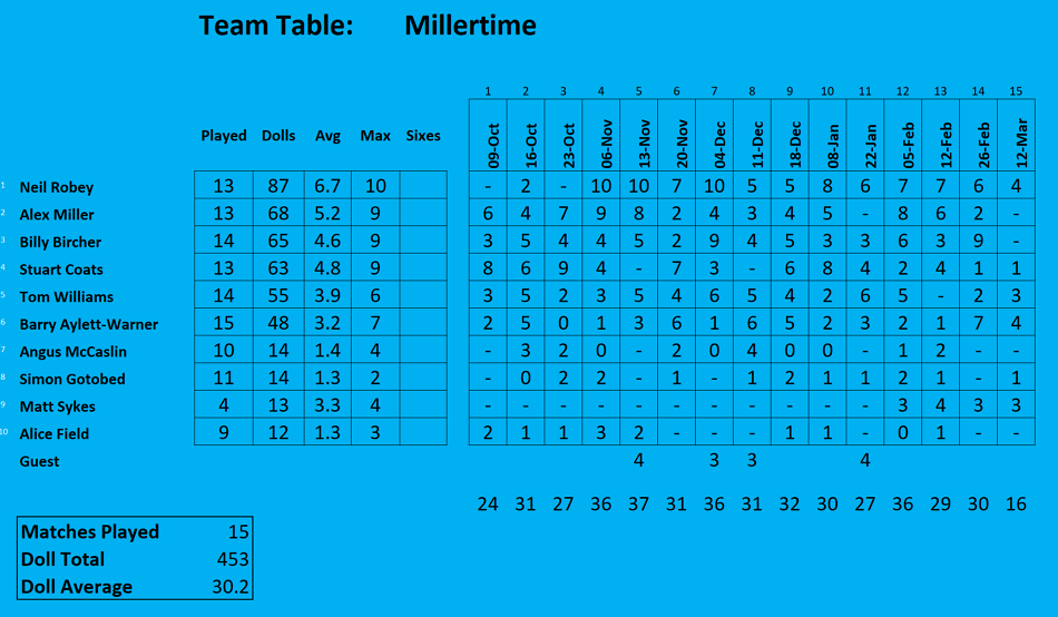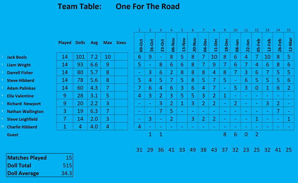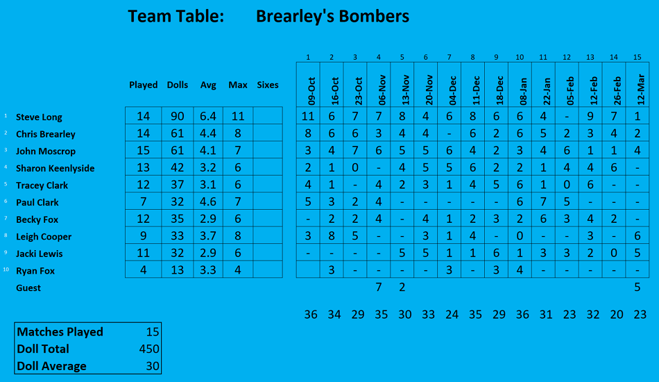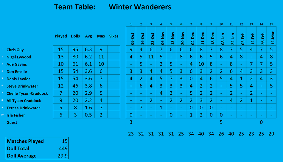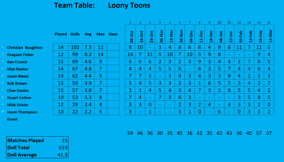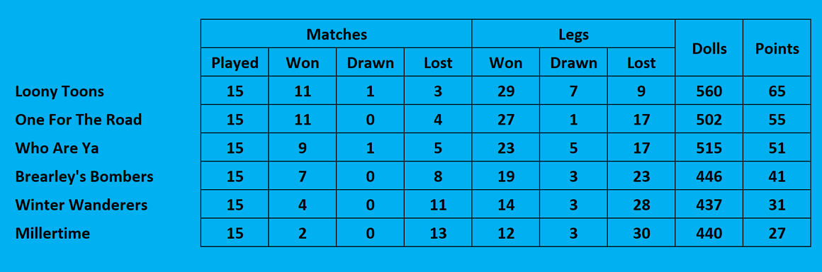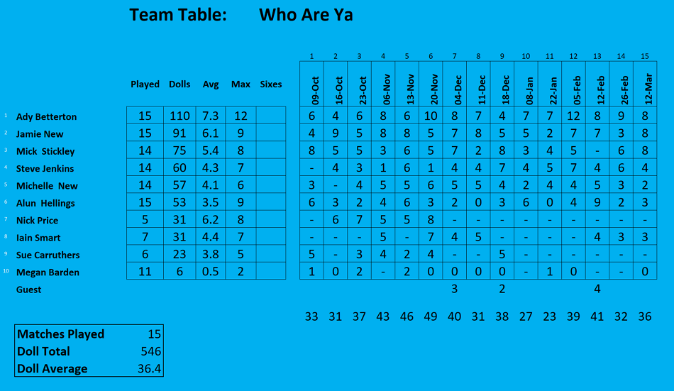 | League Table doll totals will always be less than Team Table doll totals, because only the highest six player scores per leg contribute to the League Table | ||